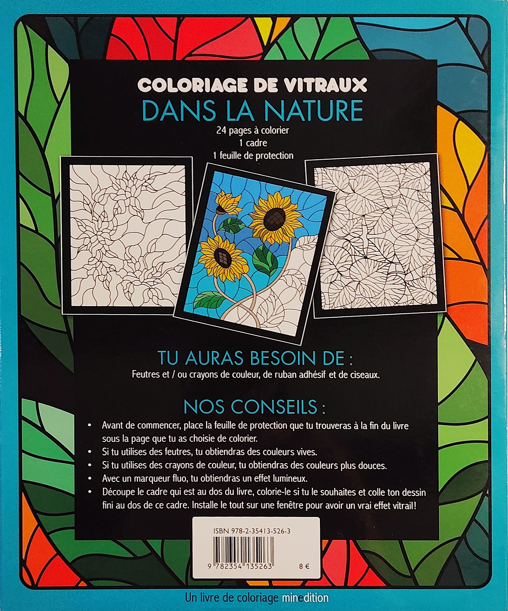 Livre de coloriages vitraux détachables comportant 24 dessins transparents variés sur le thème de la nature.