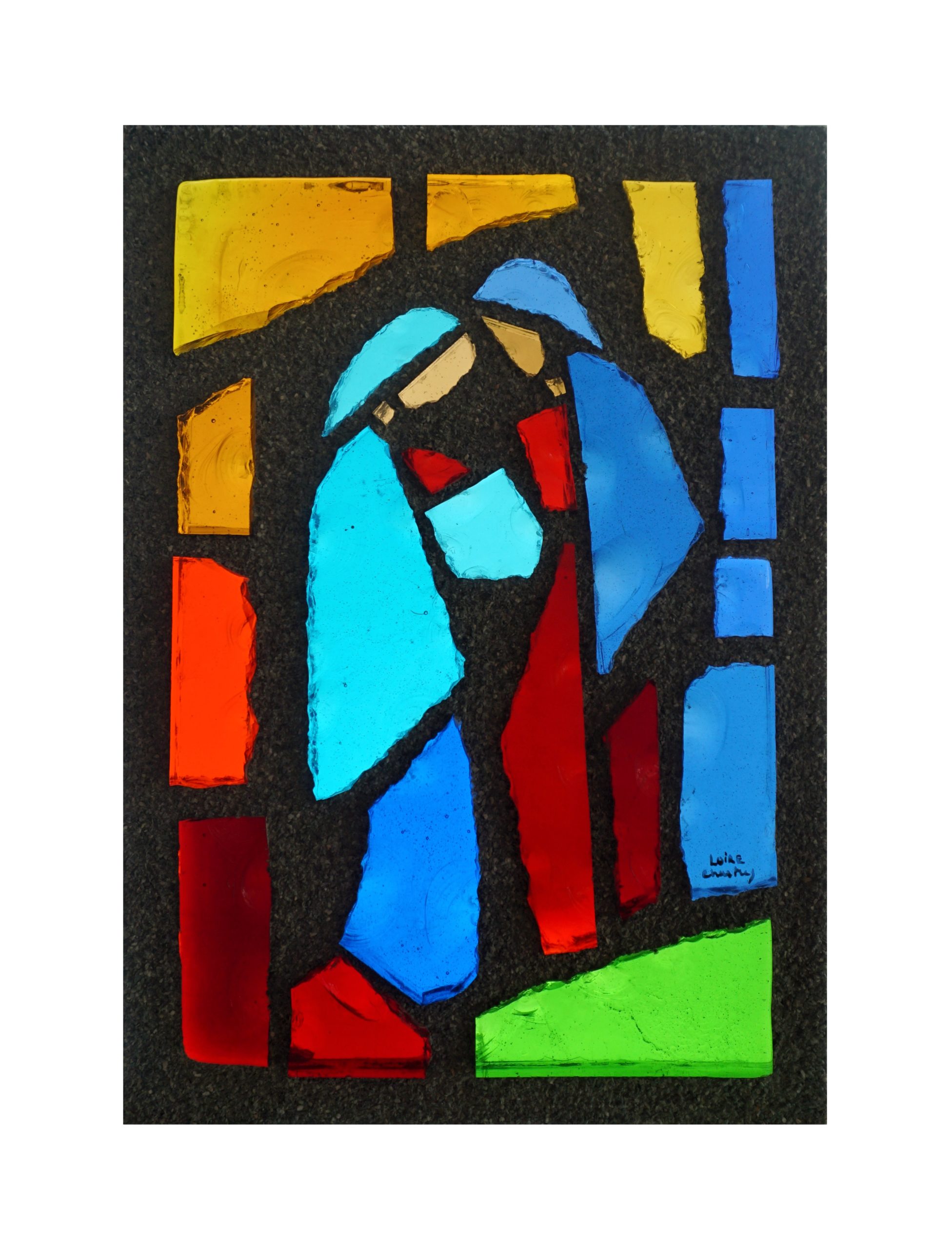 Vitrail figuratif de style moderne représentant 2 personnages face à face.